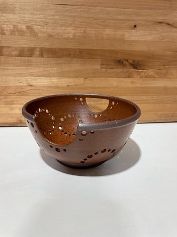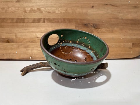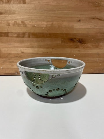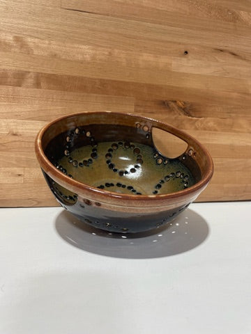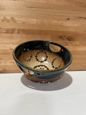 hand thrown stoneware colander/berry bowl with assorted glazes and raw clay designs.