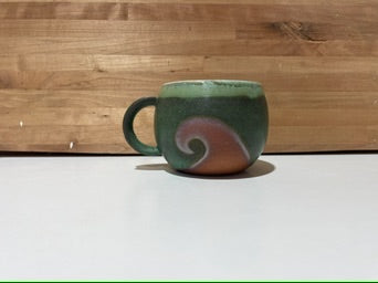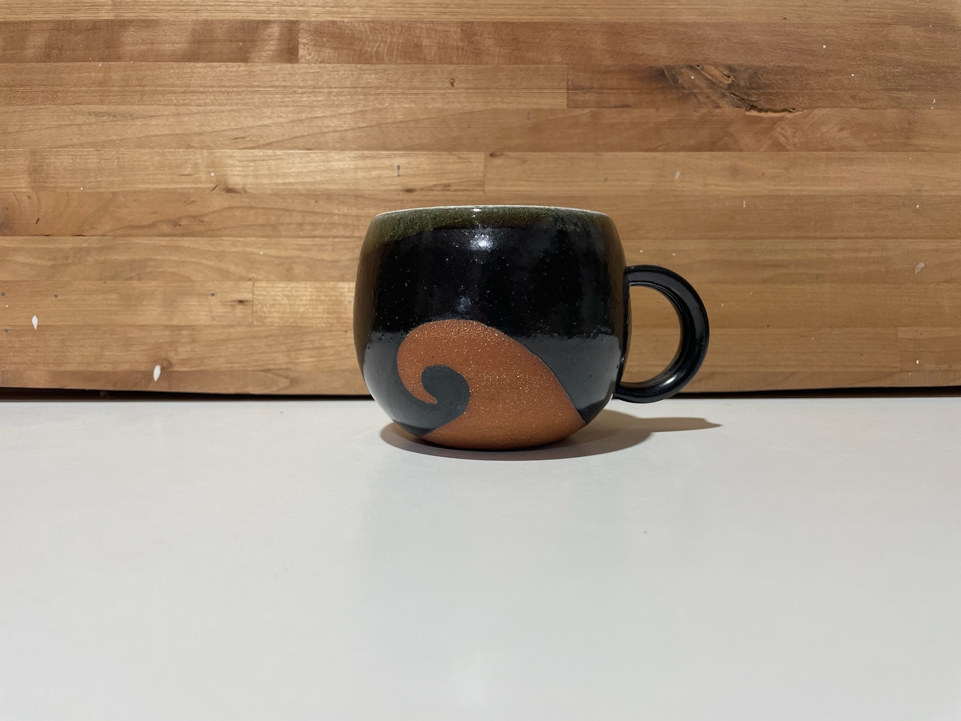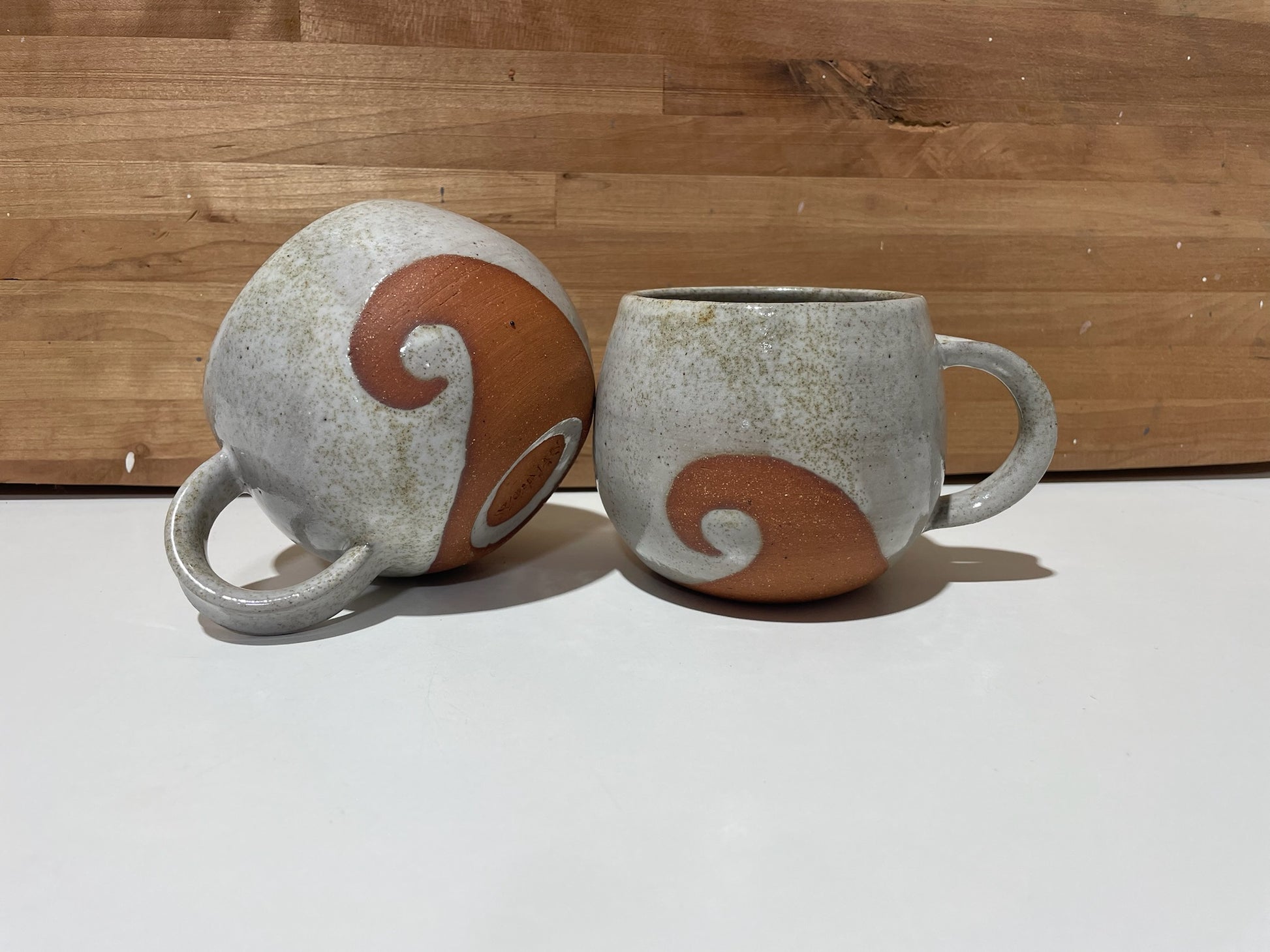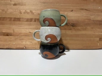 Hand thrown stoneware with raw clay design. The waves on these mugs are created by hand painting wax resist before glaze is applied.