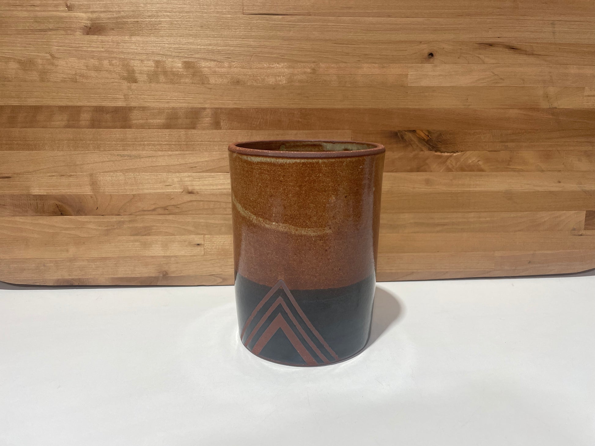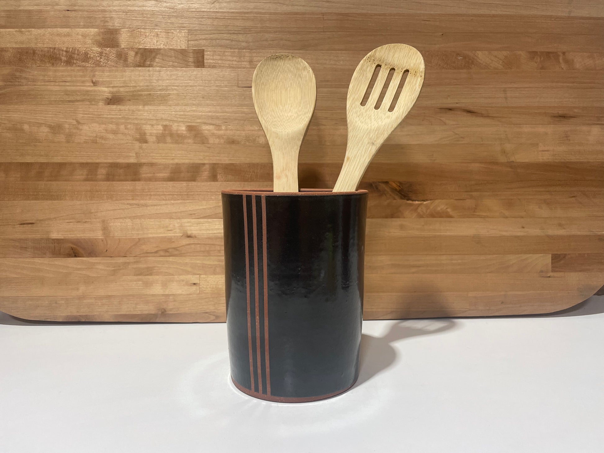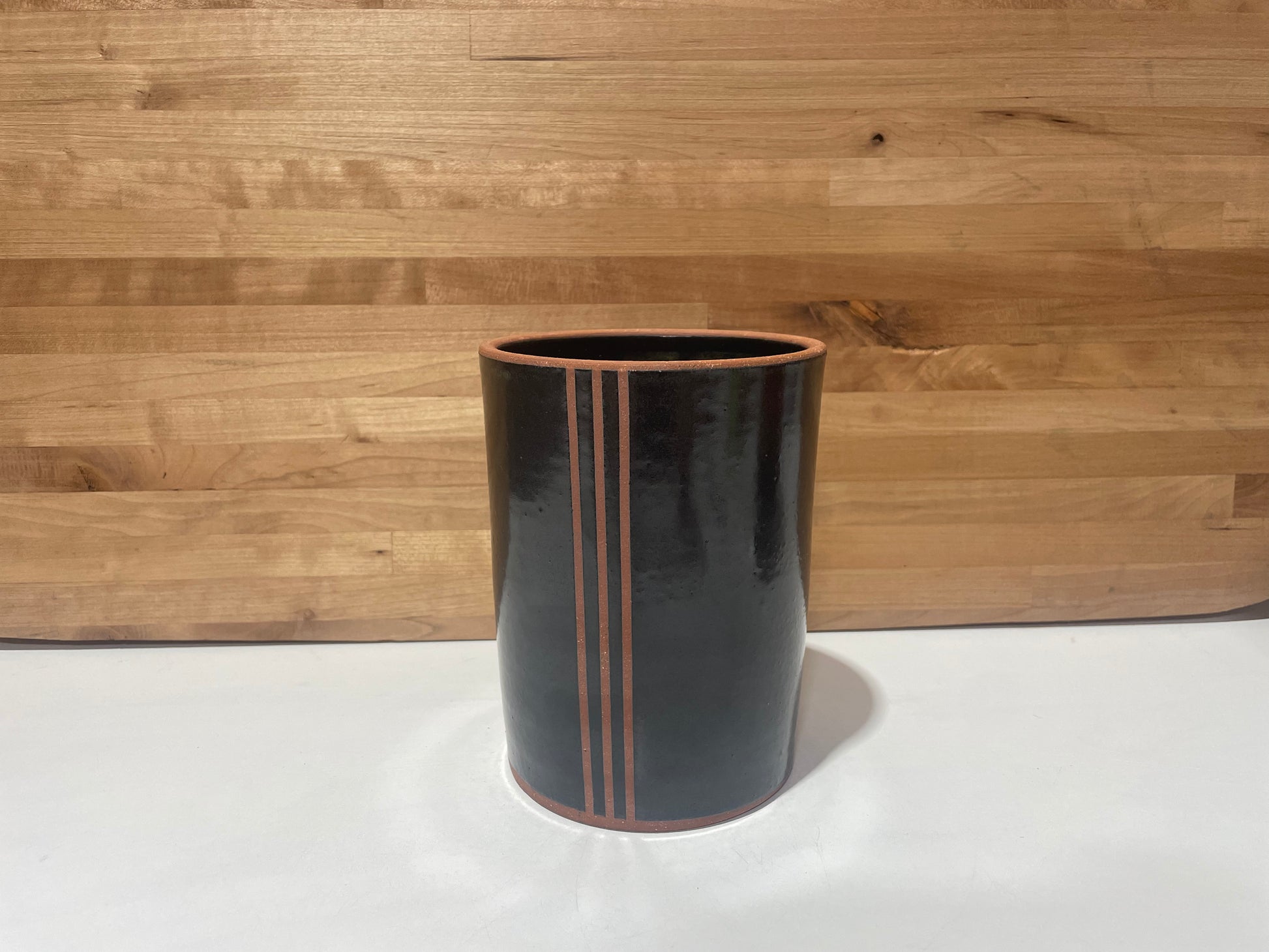 Hand thrown red stoneware with raw clay design. This vessel could have many uses, one of them a kitchen utensil holder.