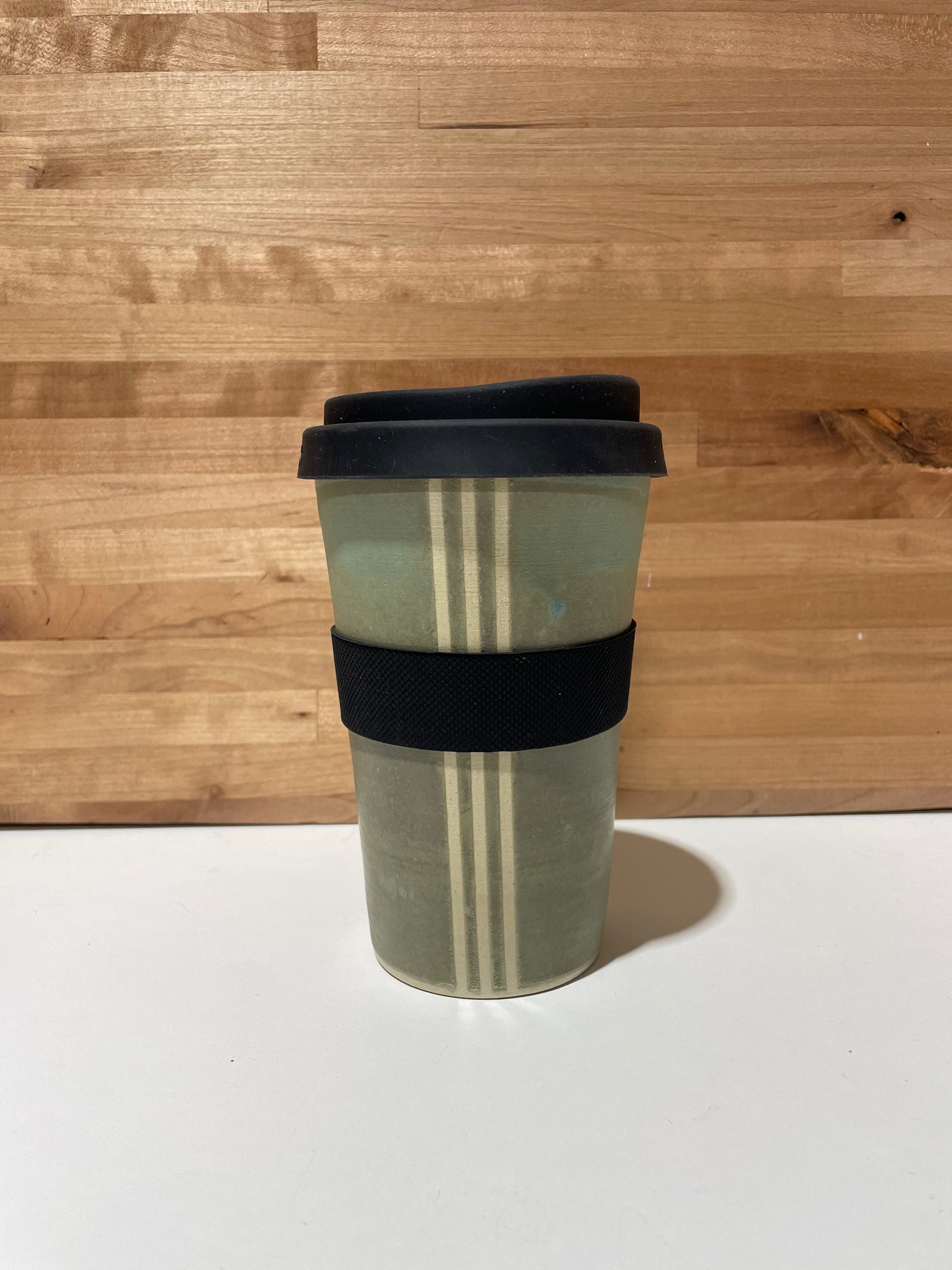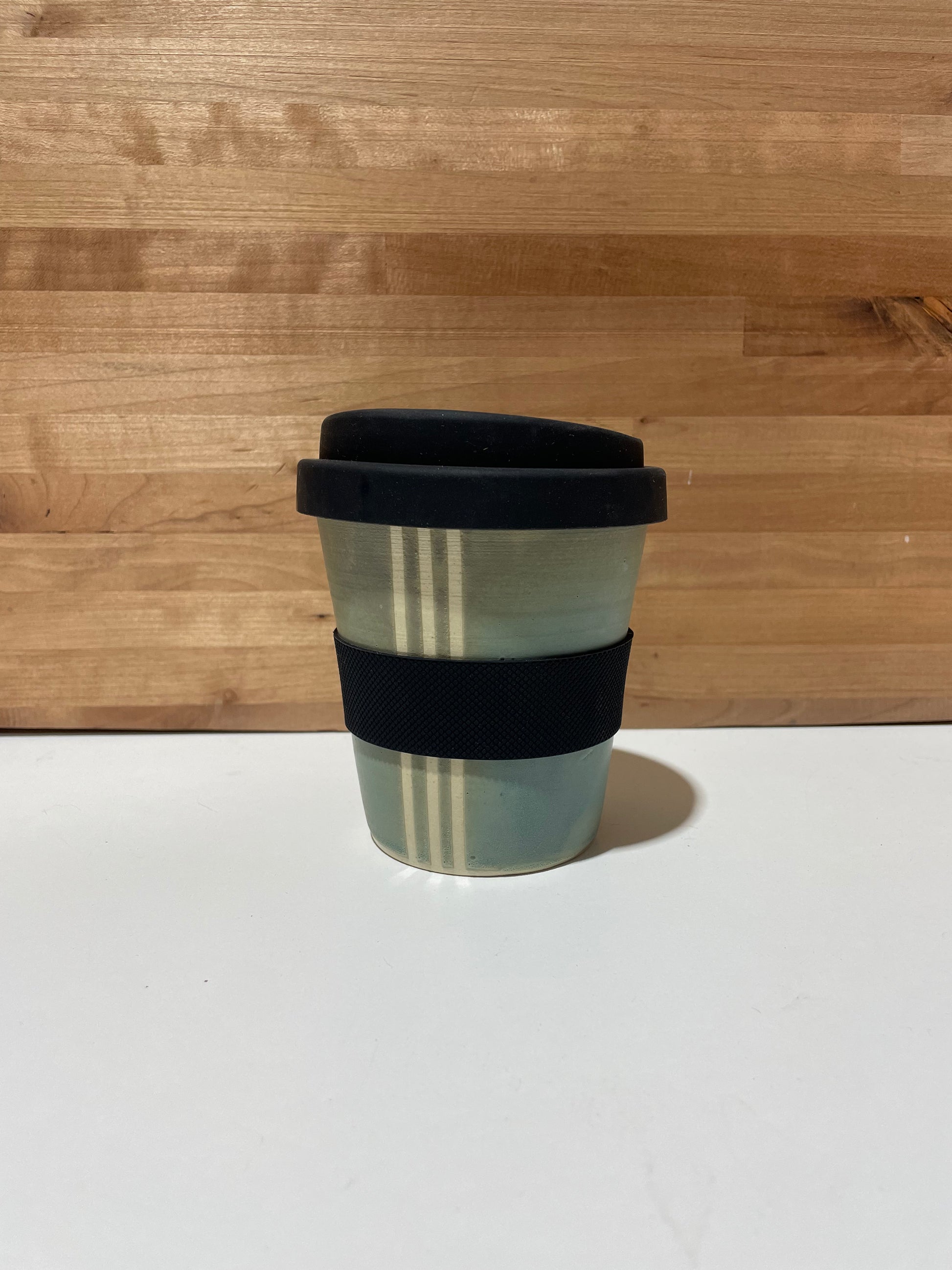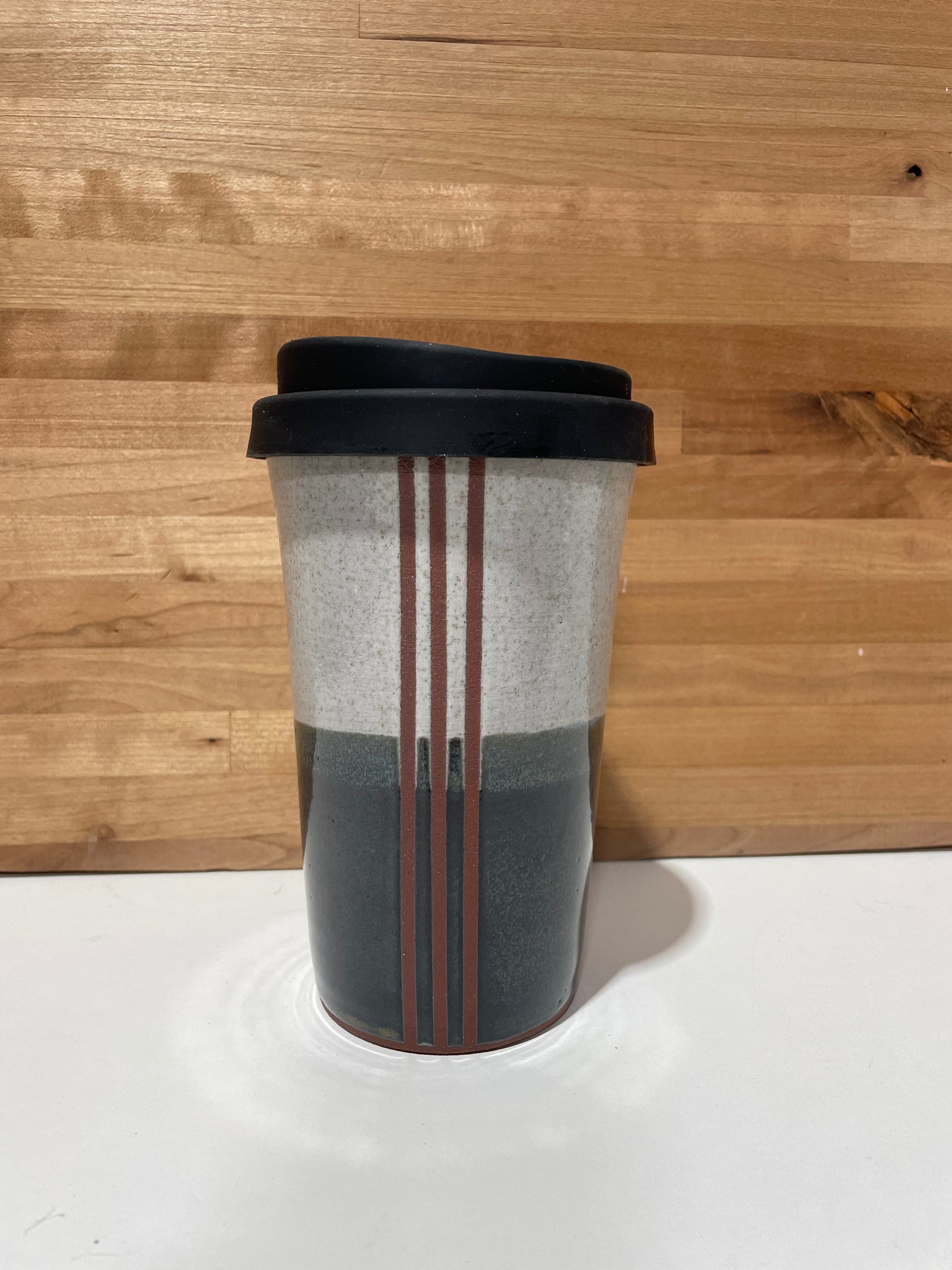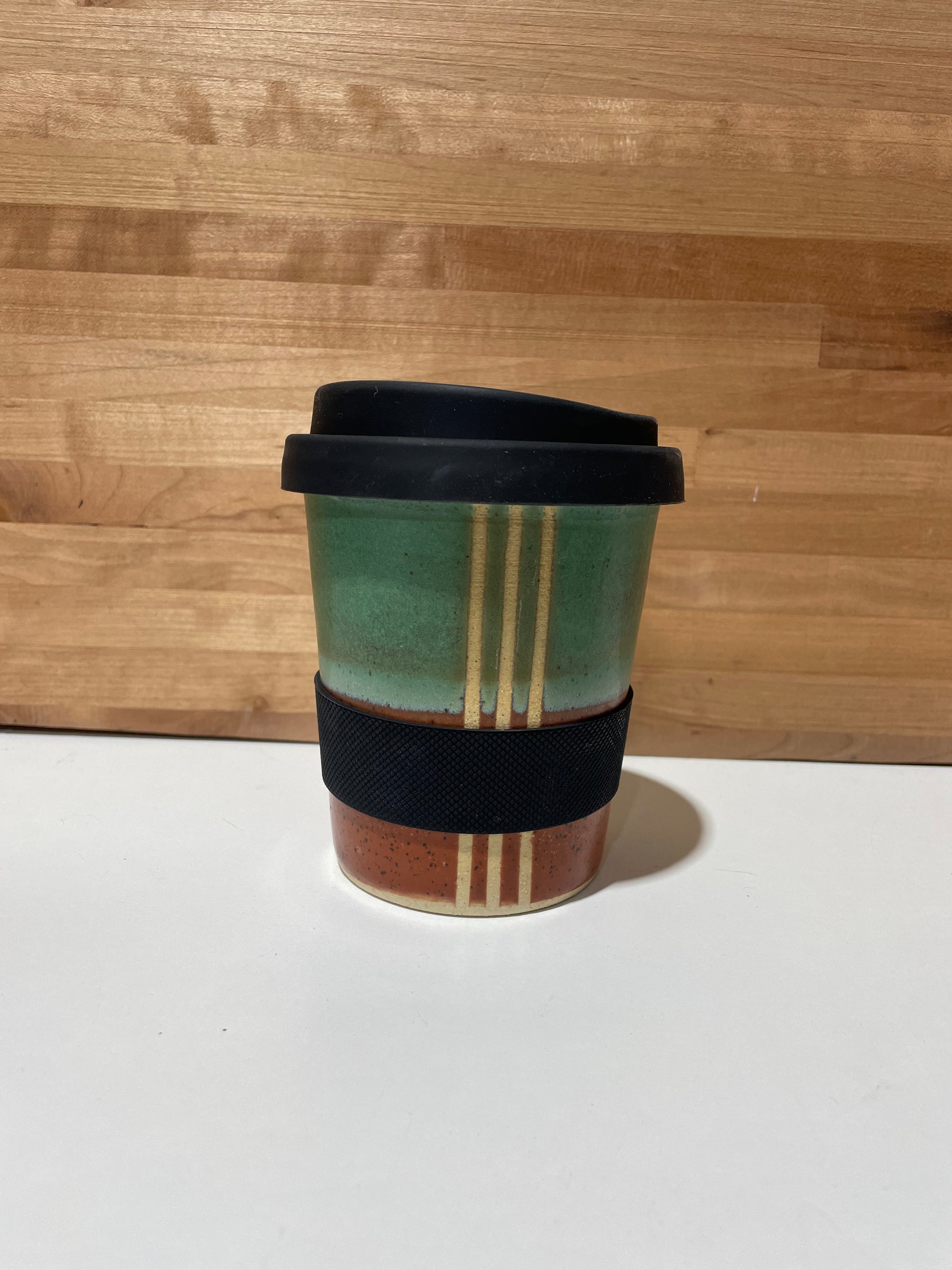 wheel thrown travel mug. come with reusable silicone lid and sleeve.