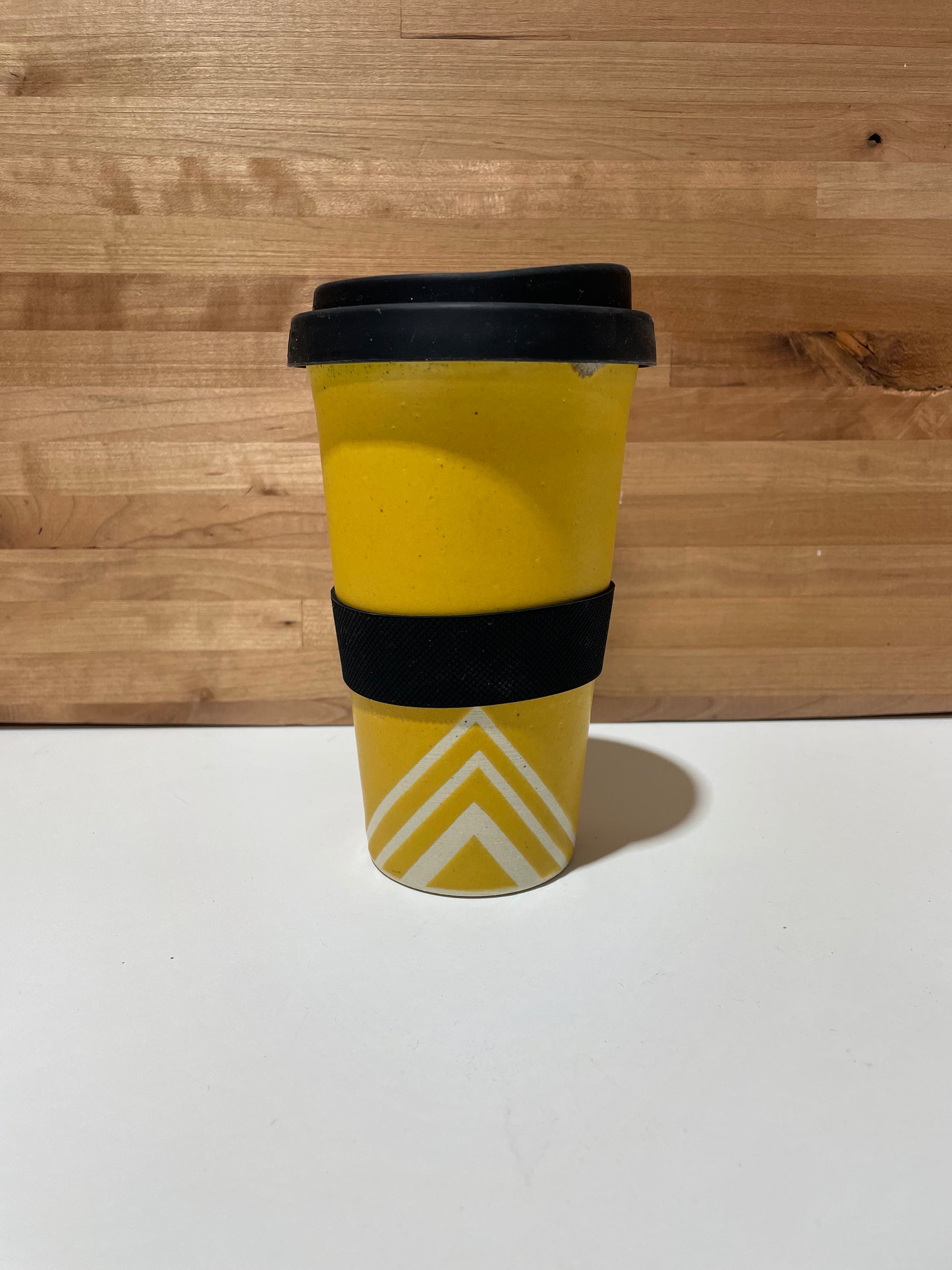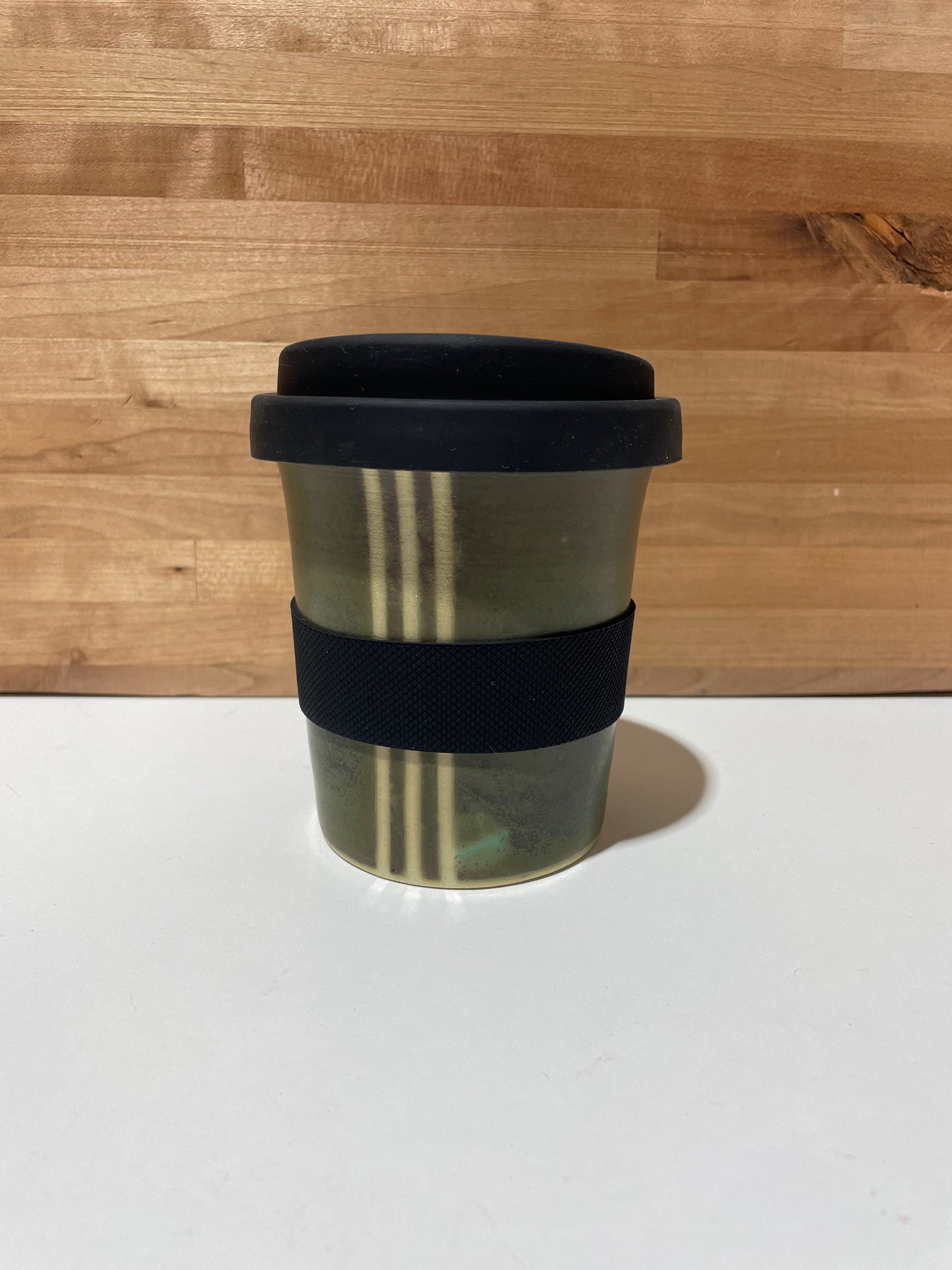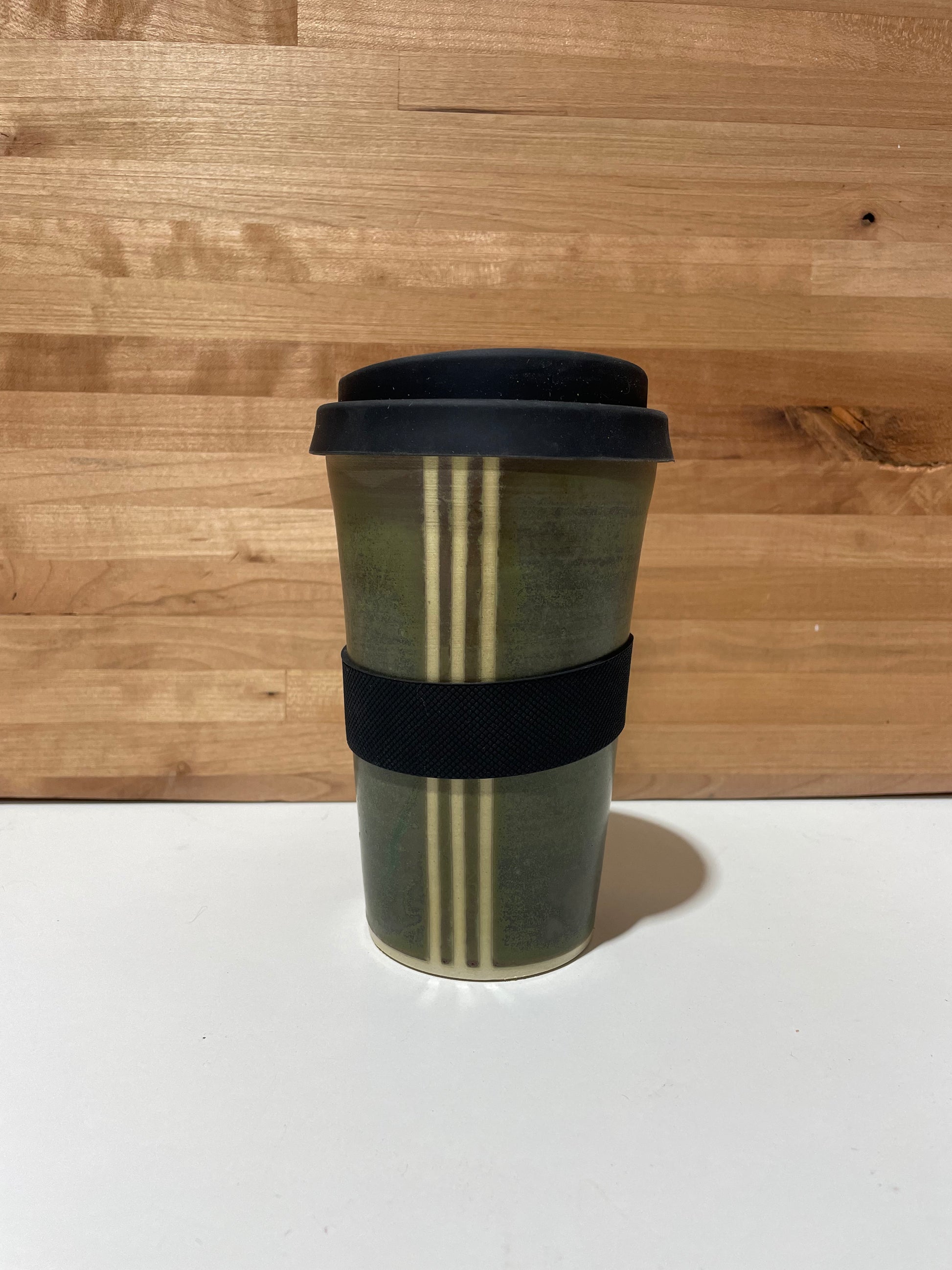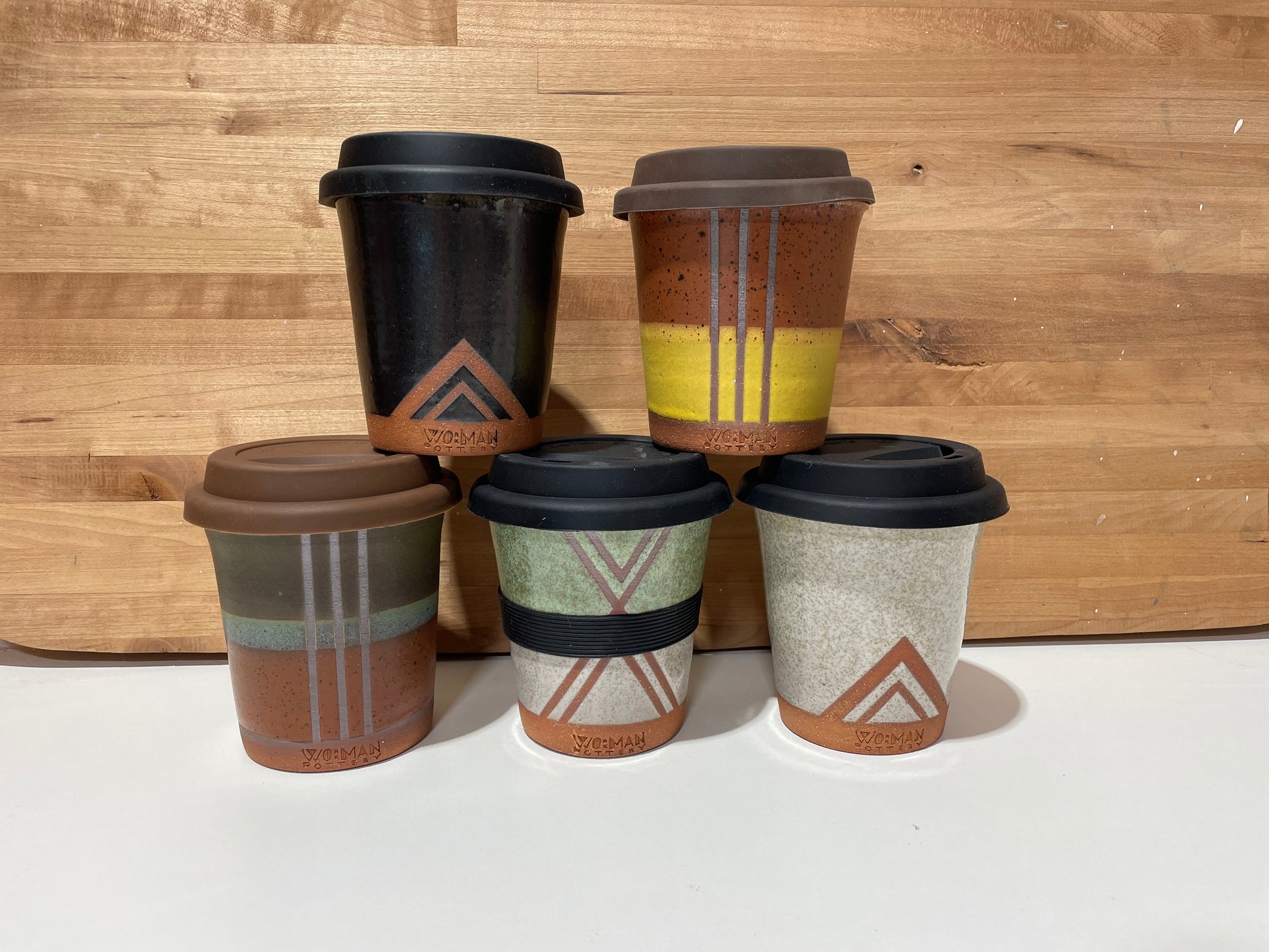 wheel thrown travel mug. come with reusable silicone lid and sleeve.